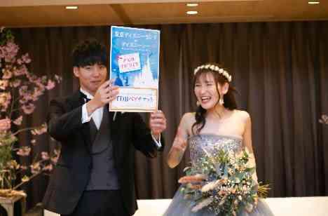 友人の楽しい乾杯からスタートしたご披露宴! 桜を取り入れた春らしいコーディネートで会場は和やかな雰囲気に… ようやく緊張もほぐれたお二人の笑顔を見ることができました(^^♪ また、ゲスト全員参加型でのゲームもされていたお二人ですが ディズニーのペアチケットもあたる豪華景品に 会場は大盛り上がり!! たくさん楽しんでほしい!という お二人からのおもてなしに大満足の皆様でした!