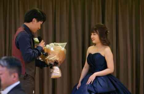 披露宴の演出では、人が人を思う心から、たくさんのサプライズが会場を感動に包みました。まずはウェディングケーキ入刀の際、抽選で1名様にお二人からのサプライズバイト。新郎友人スピーチでは友人から新郎様へサプライズDVDの上映。余興ではお父様から新婦様へ心のこもった歌のプレゼント。お開き前には新郎様から新婦様へ花束と手紙のプレゼント。 最高の披露宴になりましたね。 本当におめでとうございます!