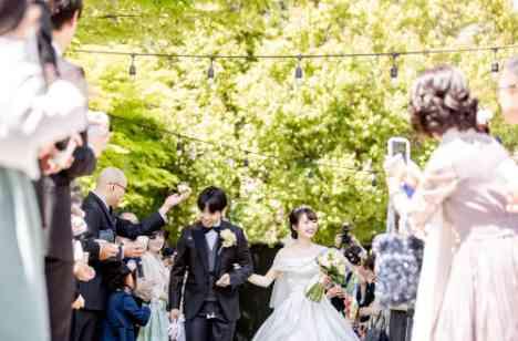 お二人の挙式はゲストの皆様を承認とする「人前式」 その挙式を海外でも人気のガーデンで行いました。 ゲストと自然に包まれる中、新郎様はお母様によるジャケットセレモニー。 お父様と一緒に歩まれる新婦様は今までの人生を思い出しながら、新郎様の元へ。 皆様に見守られ、自然の中を退場されるお二人にオリジナルのリボンシャワー♪ お二人の満面の笑みは祝福をするゲストをも笑顔にしました!