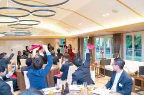 再入場では、カーテンオープンしたその先に新婦様が熱唱♪♪ あまりにも力強く、美しい歌声に大歓声!!! 曲当てクイズをしていたお二人♪ 新婦様が歌を好きなのは列席するゲスト皆さんがご存じでした。その中でもどの曲を歌うか当てるのは難しいそうでしたね!(^^)/ 見事に正解したゲストの中から抽選で一人様にお二人からのプレゼント♪ 新婦様の歌もプレゼントも 大盛り上がりの入場でした(^^)/
