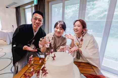 披露宴の入場はそのまま和装で入場♪ ウェルカムスピーチでもゲストを笑顔にするお二人(^^)/ 披露宴スタート♪ ウェディングケーキはシンプルで和を連想させたいと お二人のオリジナルデザイン(^^)/ ファーストバイトの後は、大切なゲストへサンクスバイトを披露!! 笑顔いっぱいのスリーショットも最高でした(^^♪
