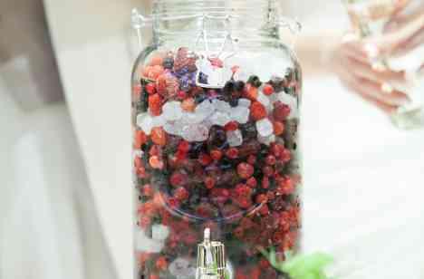 ご結婚式の中でお二人が大変楽しみにしておられた時間が【ゲストとのふれあいのお時間】たくさんお話しをしたり、いっぱい写真を撮ったりと、とても和やかなひとときをお過ごしになられておりました♪ゲストの皆様のテーブルを回りながら集めた果実にお二人でスミノフを注いで、幸せ味の果実酒の完成です♪