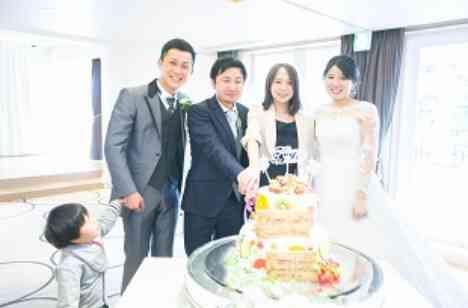先輩夫婦のケーキ入刀!そしてお手本バイト! 新郎新婦様だけでなく、先輩夫婦のお二人も幸せを再実感できる時間だったのではないでしょうか♡ そのあとのお写真でも、4名ともとても幸せそうな表情をされていますね♪ お子様もとても元気で、とても楽しい披露宴になりました!