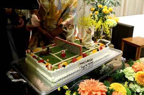 出会いがテニスだというお二人はテニスコートをイメージした ウェディングケーキをご準備されました。 お食事のない披露宴でも定番のケーキ入刀だけは見て貰いたいという お二人からの思いにご親族の皆様もとてもお喜びでした。