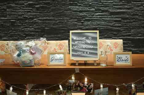 お打ち合わせから『ゲストの方に喜んでいただくには』を考えられたお二人は、会場内に飾るウェルカムグッズにもこだわられました。ゲストの方々が見て楽しんでもらえるものや、これまでのお二人の思い出が詰まった空間を用意されました。参列されたゲストの皆様もアットホームな空間で、穏やかなひと時を過ごして頂きました。