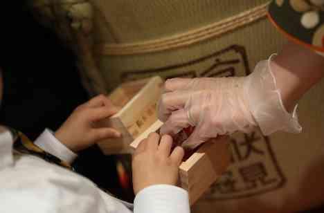 和装へのお色直し後の鏡開きでは、中からお菓子が出てくるというサプライズ演出に、ゲストの皆様から会場内を包み込む拍手が起こりました。鏡開き後はゲストの皆様に感謝の言葉をかけながら用意されたゲストの方それぞれの名前入りの枡の中にお菓子を配られました。大人から小さいお子様まで楽しんで頂ける、温かい演出でした。