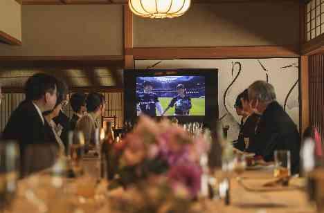 再入場時に選ばれた曲は「FIFA ANTHEM」!! 再入場演出では、 おふたりらしく サッカーボールチョコを配りながら 皆様のもとに歩んでいかれました* ここでもおふたりの 強いサッカー愛が感じられました♡ ご家族婚でも、映像や司会、音響も入れていただき メリハリのあるご会食でございました!