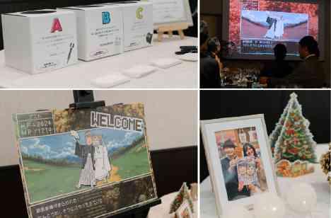披露宴を盛り上げるためいろいろなアイテムを自作しました。控室にはウエルカムボードやクイズ用の抽選箱を用意し、クイズ当選者には披露宴で景品をプレゼントしたり、新郎新婦のプロフィールムービーは新郎力作(このためにノートPC買ってました笑)結果、会場はめっちゃ盛り上がったので、大変だったけどやってよかったです!
