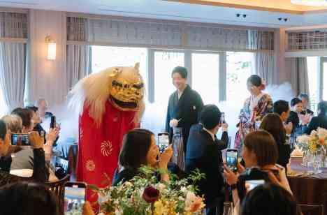 新郎がずっと昔から「新郎新婦の入場シーンは絶対に獅子先導をやる」と決めていたそうで、実際の入場後も感無量なご様子で「夢が叶った」「ずっとやりたかったことがやっとできた」などとても満足したようです笑。入場直前に大量のスモークの中から獅子が登場した瞬間は、ゲストはびっくりしながらもすごく盛り上がってくれたました!そしてこの直後に新郎は自身のウエルカムスピーチで大号泣していました笑笑
