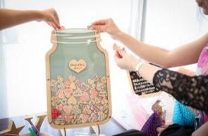 ハートの台紙にゲストひとりひとりからメッセージを書き込んでもらいWELCOMEボードを完成させていく。瓶の形のボードの中に、カラフルなハートのメッセージが。みんなの思いがこもった世界でひとつだけのボードが完成して、お二人の新居に飾られる。