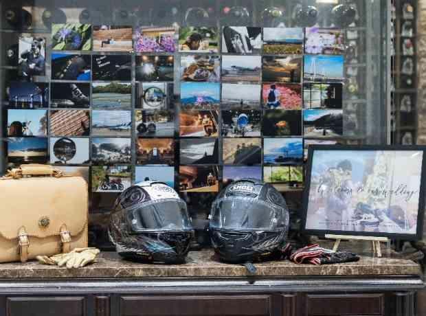 晴天に恵まれた日。ゲストの皆様をお出迎えするのはおふたりの趣味として挙がったバイク。実は前撮りでも同様にバイクを並べて撮影しました。ウェルカムスペースには、前撮りの写真に加え、出会いのきっかけにもなったカメラで撮りためた写真をゲストにも・・・壁いっぱいに写真を貼ることでおふたりの想い出に浸っていただきます。