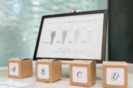 この日は新婦様から新郎様へサプライズがいっぱい。ケーキ入刀後、新婦様が中座中にスクリーンが下り、新郎様へのサプライズムービーを上映、中座後、お支度部屋にはなんと新婦様から新郎様へのサプライズとして2着目タキシードのご用意がございました。新郎様は驚きと嬉しさのあまり涙でいっぱいに。そんな中ご披露宴会場ではタキシードの色当てクイズが行われていました♪