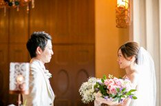 大好きな愛娘と一緒に結婚式を出来る喜びをかみ締めたいと、お嬢さんが大きくなるまで挙式を待たれたお二人。一瞬だけ新郎と新婦になれる瞬間を・・・と、当日ファーストミートを行った。扉が開かれ、花嫁になった愛佳さんをご覧になられた智貴さんは、いつもは恥ずかしくてなかなか言えなかった言葉と、共に新婦をイメージしオーダーした花束を渡された。その瞬間、新婦から大粒の涙が・・・。礼拝堂が温かな空気に包まる。