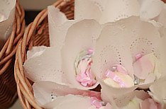 リボンが大好きな新婦さんはフラワーシャワーにもリボンを織り交ぜて華やかさをプラス。リボンが舞った時に映えるようにパステルカラーでリボンの色を統一されるという、こだわりよう。ゲストが持ちやすい様にフラワーコーンを作り、ひとりづつ配る心遣いにゲストも感動。お2人の歩く道を先導するフラワーボーイも楽しそうに青空の下歩かれていた。