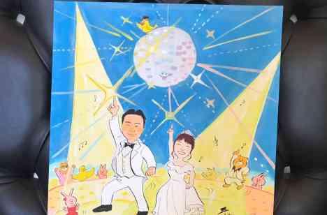 ライブが大好きなご新婦様。新郎様と一緒に見に行くこともあったそう。 そんな二人の希望で、ウエディングテーマは『ミラーボール』に決定☆ ちょうどクリスマスシーズンにご準備をされていた為、オーナメントのミラーボールを大量購入。 会場の至る所へ設置します☆ また、ウェルカムボードの似顔絵にも大きなミラーボールの下でダンスをする新郎新婦様が!