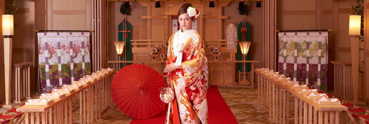 専門式場内の神殿にて行われる神前式は、日本古来の伝統的な挙式スタイル。衣装は、新郎は紋付袴(もんつきはかま)姿、新婦はせっかくですから白で統一した白無垢(しろむく)+綿帽子の組合せにチャレンジしてみて
