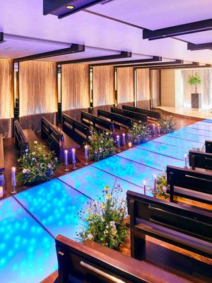 一歩ずつ歩みを進めるとゆっくりと青く光り、 お二人の輝かしい未来を祝福するように幻想的なブルーのヴァージンロードがいつもとは違う非日常を演出してくれる結婚式の一場面を彩るチャペル。 あこがれの結婚式を他とは違う幻想的なひとときをお過ごしいただけます。