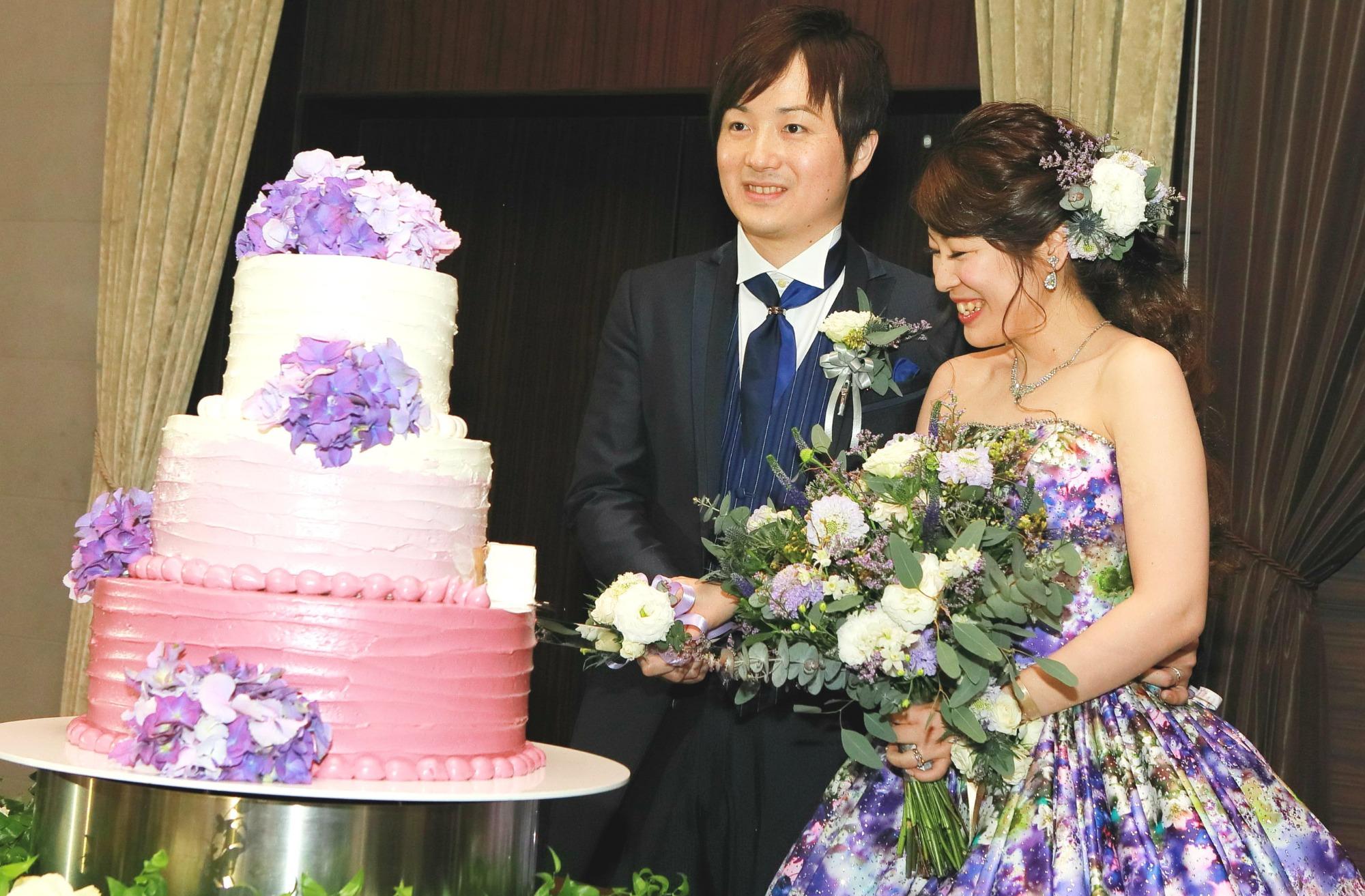 紫陽花の生花を使用し、可愛らしいグラデーションケーキをこだわっていただきました。 ドレスに合わせて、色鮮やかで素敵なウェディングケーキになりました♪