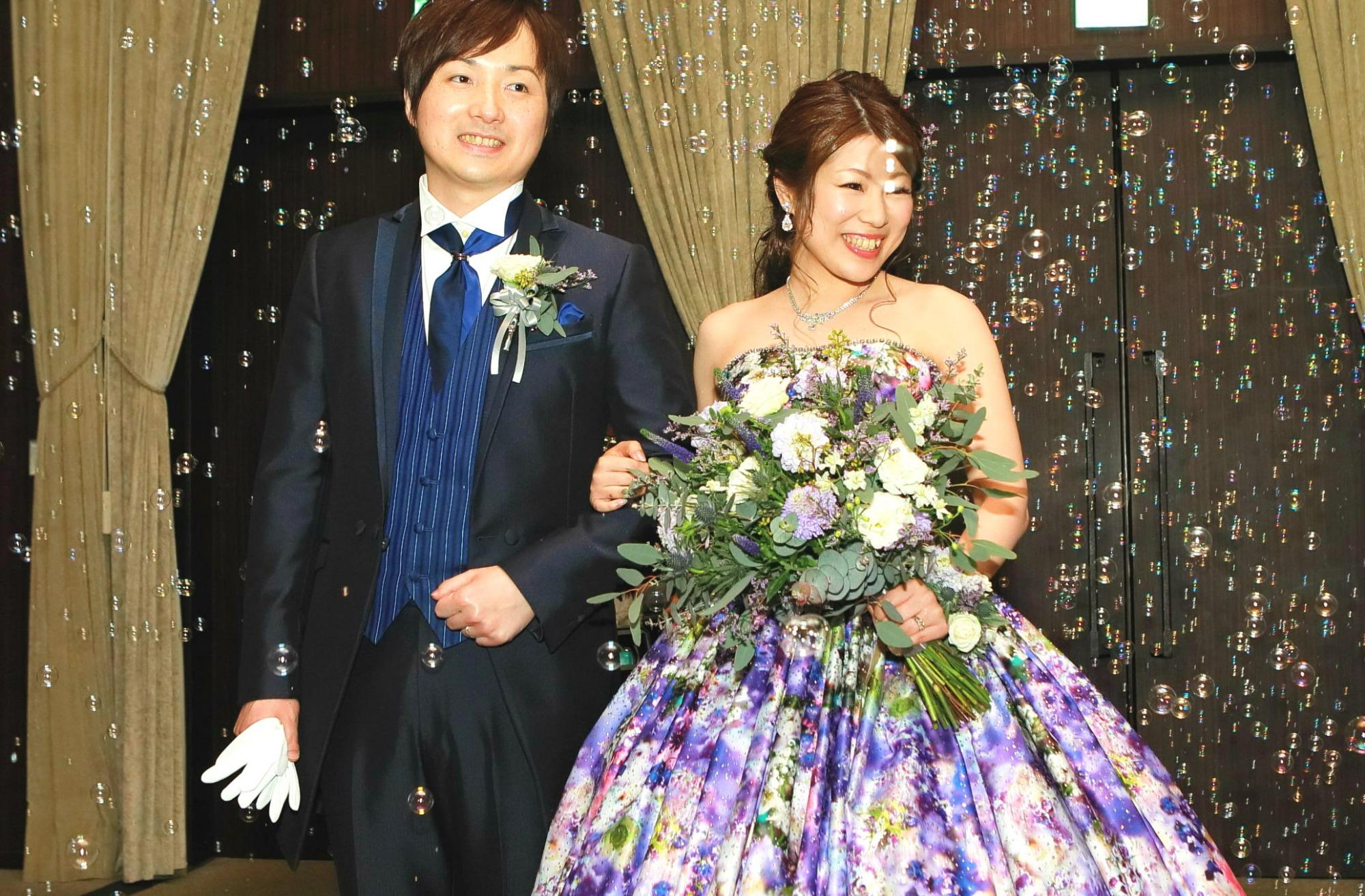 お色直しでの入場の際に、バブルシャワー演出を行いました♪ ゲストの皆様にサプライズでしたので、皆様もお喜びいただいておりました。