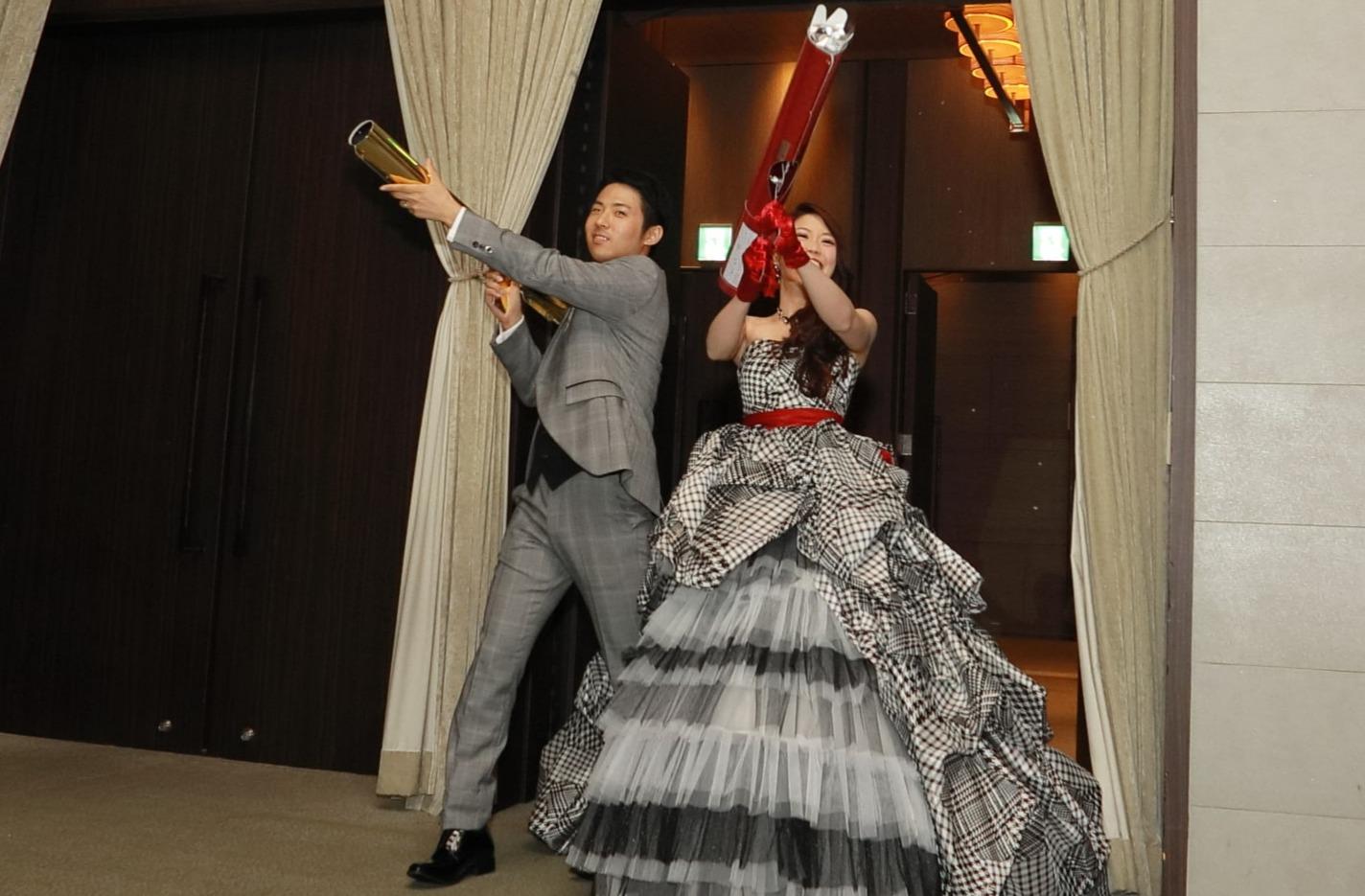 お2人のテーマがタイトル通りのテーマでした。 そこで、お色直し入場を巨大クラッカーを使って入場することになりました。