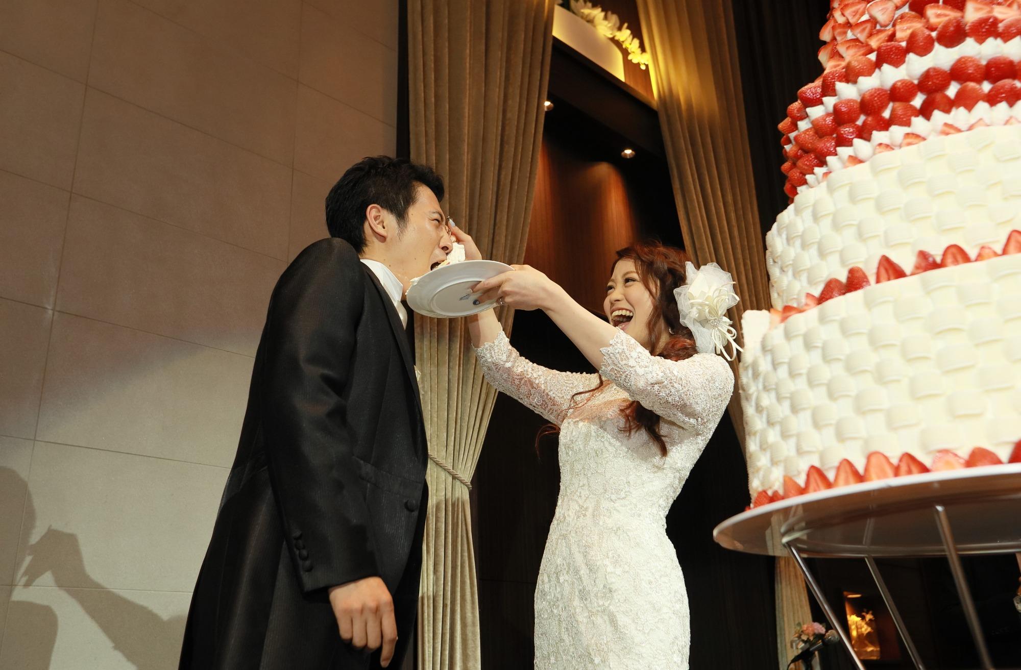 ゲストの皆様がビックリするくらいの大きなウェディングケーキが登場!ケーキ入刀の後に、ファーストバイトを行いました♪