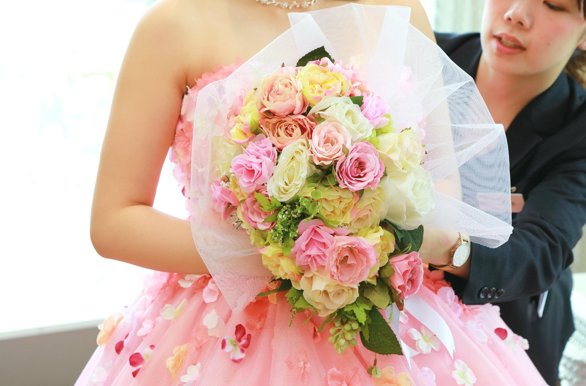 新婦様のお母様がお作りになられた色鮮やかなブーケ。このブーケをテーマに会場装飾のお打合せを行いました。 当日だけでなく、前撮りでも大切に新婦様がブーケを持たれているお姿を見て、親子の絆をとても大切にされていらっしゃる新婦様でございました。