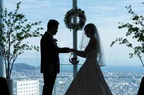ゲスト思いなお二人は景色のプレゼントをしたいということでスカイチャペルでの挙式をお選びになりました。 サプライズで景色を見せたいというお二人の希望もありカーテンのオープンのタイミングや外の景色が見えるように曇りガラスから透明なガラスにするタイミングなども気にされていたゲスト思いで少しお茶目なお2人でした。