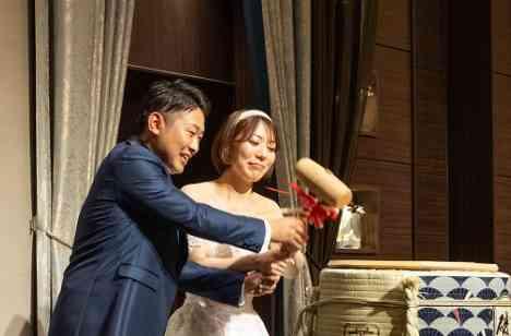 ゲストもお2人もお酒が好きだというお話をお打合せの中でお聞きしたのでケーキ入刀ではなく日本酒の樽酒の蓋を初めての共同作業とするか鏡開きをご提案させていただきました。 お二人共、大盃で日本酒を飲み交わしていらっしゃいました。 お二人がお飲みになった後はゲストの方々に振舞われ、お酒好きなゲストにも大変好評をいただいた演出となりました! ゴムパッチンプルズも行われ会場内は大盛り上がりでした。