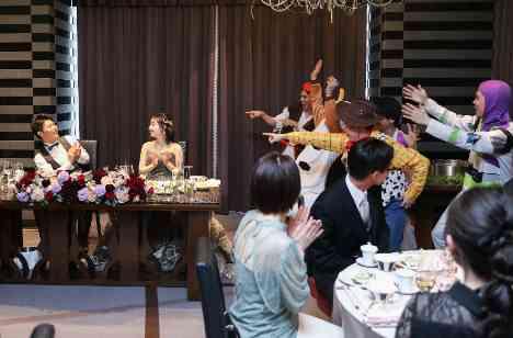 友人の方余興をお願いしたところ、ディズニー風のパレードを行い、流行りのジャンボリミッキーをみんなで踊りたいとご要望を頂きました。披露宴中、お着替えを行いそれぞれキャラクターに大変身!会場は一気に盛り上がりました。新郎様もダンスに参加し、みんなで披露宴を作り上げることができました。最後には、新郎様から新婦様へサプライズで花束をプレゼント!