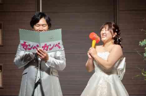 披露宴のはじめの新郎様からのごあいさつでは、緊張すると噛んでしまうとの事で新婦様がピコピコハンマーを用意!噛んだら叩きますと、意気揚々とされていました。実際緊張された新郎様は、カンペを読むも噛んでしまい、ピコン!と叩かれていました。そんな様子に会場も笑いの渦包まれ、笑顔沢山のおふたりらしい披露宴になりました。