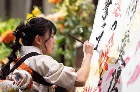 披露宴ではご友人の書道パフォーマンスが行われました。迫力のあるダイナミックなステージで、ゲストの方から歓声が上がりました。そして新郎新婦様こだわりのゼリータワーも!ウエディングケーキとは別で用意されたゼリータワーは圧巻の高さ!スイーツビュッフェとともに新郎新婦様からプレゼント!ゲストの方もとっても喜んでいらしゃいました。