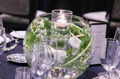 お2人のこだわりは丸いガラスの器に、グリーンを入れ、お洒落にキャンドルを取り入れたいご希望でした。 大人WEDDINGに合うコーディネートで、とてもこだわっていただきました。 それだけではなく、メインテーブル装花は上品な胡蝶蘭を使用し、沢山のゲストの皆様とお写真を撮られるので、メインテーブルの背景にも装花を置きました。