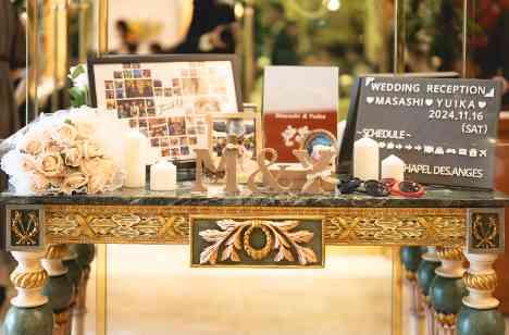 裁縫や刺繍、手作りが大好きなご新婦様と、ご新婦様と一緒に何かをすることが大好きなご新郎様。 手作りできるものは1から、たくさんの時間と愛情をかけて1つずつ作成されました。 招待状をはじめ、プロフィールブックや席札、ドレス色当てクイズの際にゲストに見ていただく色味も、 実際のドレスのミニチュアを作成されました。 ウェルカムスペースのボードも、もちろん手作りです!