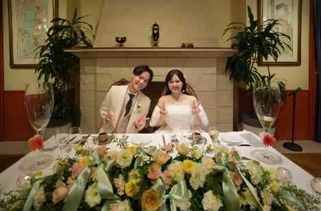 「高砂」と呼ばれるおふたりのメインテーブル。 メインテーブルに置くお花の色合いによって、会場の雰囲気は一気におふたりカラーに彩られます。 挙式のあとは緊張も解け、リラックスした表情の新郎新婦様。ここからは皆様が楽しみにされていた坂井シェフ監修のお料理を楽しみながら、大切なゲストの方々と一緒に時間を過ごします。