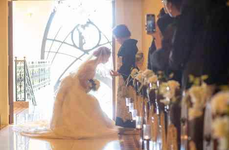 入場後、チャペル内でお母様よりベールダウンを行っていただきました。ベールはこれまで新婦様を守ってきた証。お支度の最後の仕上げとして、お母様よりベールダウンを行っていただくことで、これまで新婦様を大切に育てられてきたご家族様の想いを表したセレモニーです。その後は、これまで新婦様の隣でずっと支えてきたお父様と、バージンロードを歩いてご入場です。