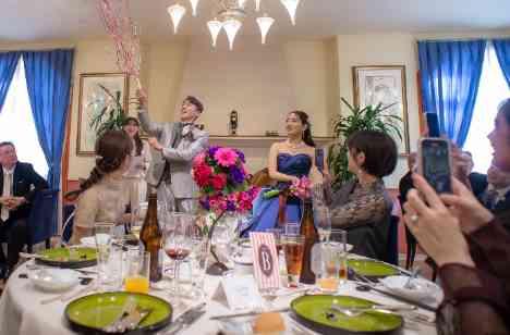 入場にはおふたりの好きな曲をかけて、おふたりらしく楽しくご入場。新婦様の上司より乾杯のご発声をいただき、披露宴スタート。おふたりのご結婚のお披露目として、ご友人、職場関係の皆様をご招待してのパーティです。挙式の厳かな雰囲気とはガラッと変わって、アットホームな雰囲気でおいしいお食事を楽しんでいただきました。