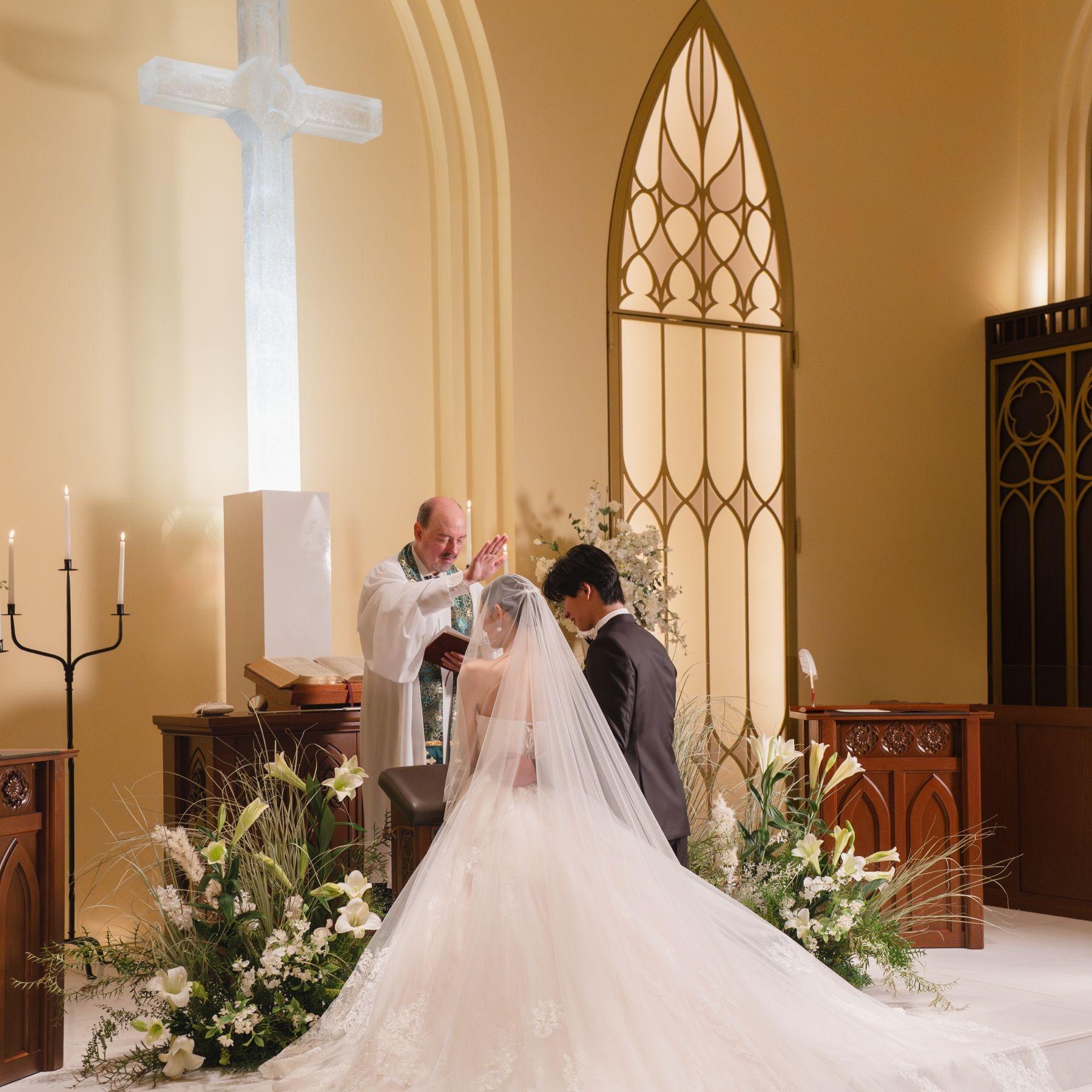 事前に牧師と "出会い~結婚への想い" を改めて感じられる機会をご用意。当日は牧師から2人の想いが語られ、祝福の言葉が贈られる。その言葉に涙するゲストも多く、心の繋がりが深く感じられる特別な挙式が叶う