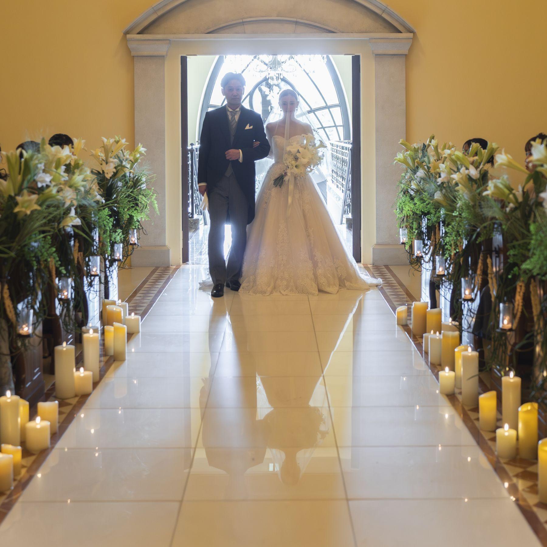 扉を開けた瞬間にふわっと香る、カサブランカが「日常の喧噪」から「非日常の世界」へと誘う。優しく包まれるような優美なチャペルで心の繋がりが感じられる誓いを。香りと共に刻まれる記憶はかけがえのない想い出に