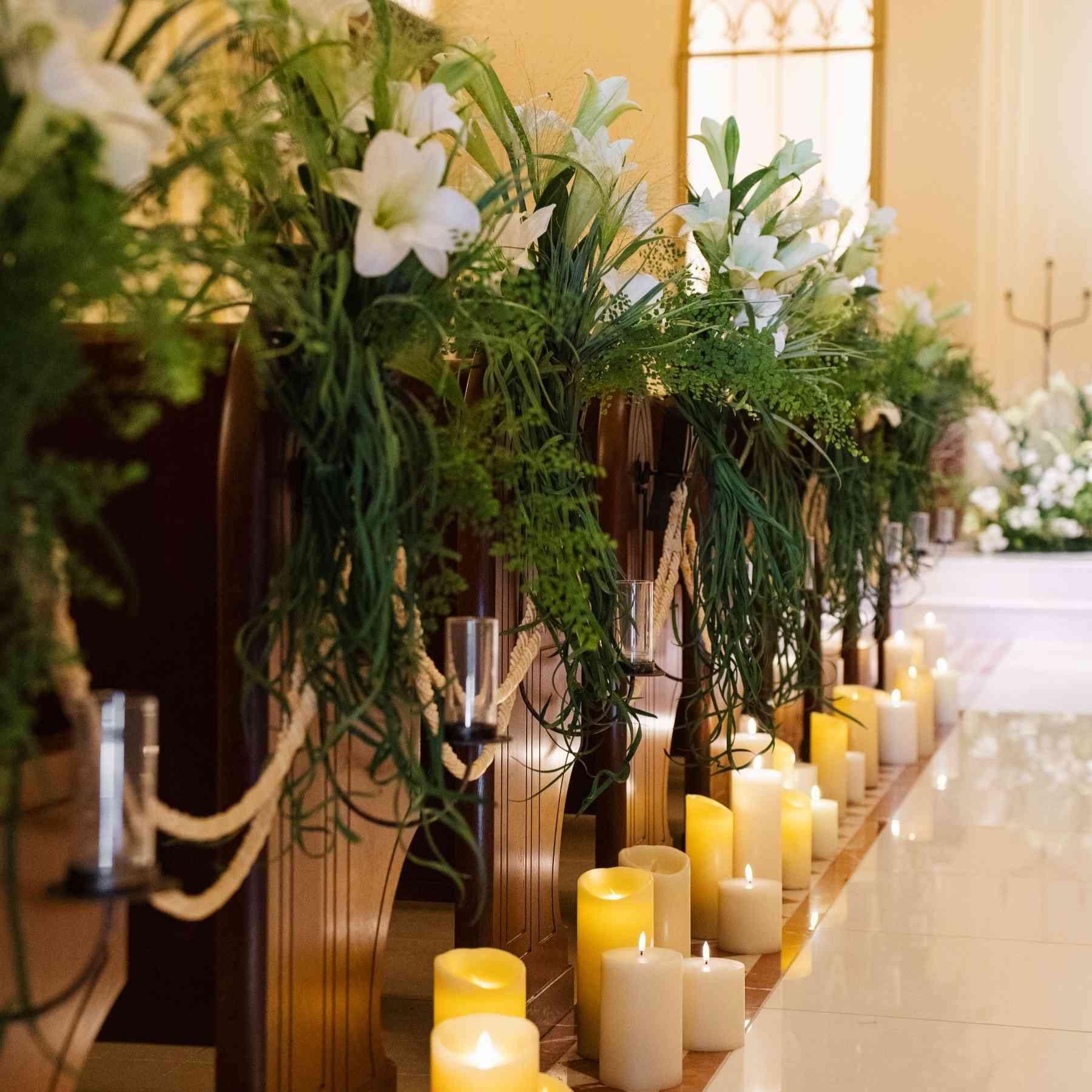 キャンドルの煌めきが美しいナイトウエディング。挙式は明るい時間、パーティのお見送りの時にはライトアップされたナイトタイムなど、おふたりのご希望に合わせた時間帯をご提案