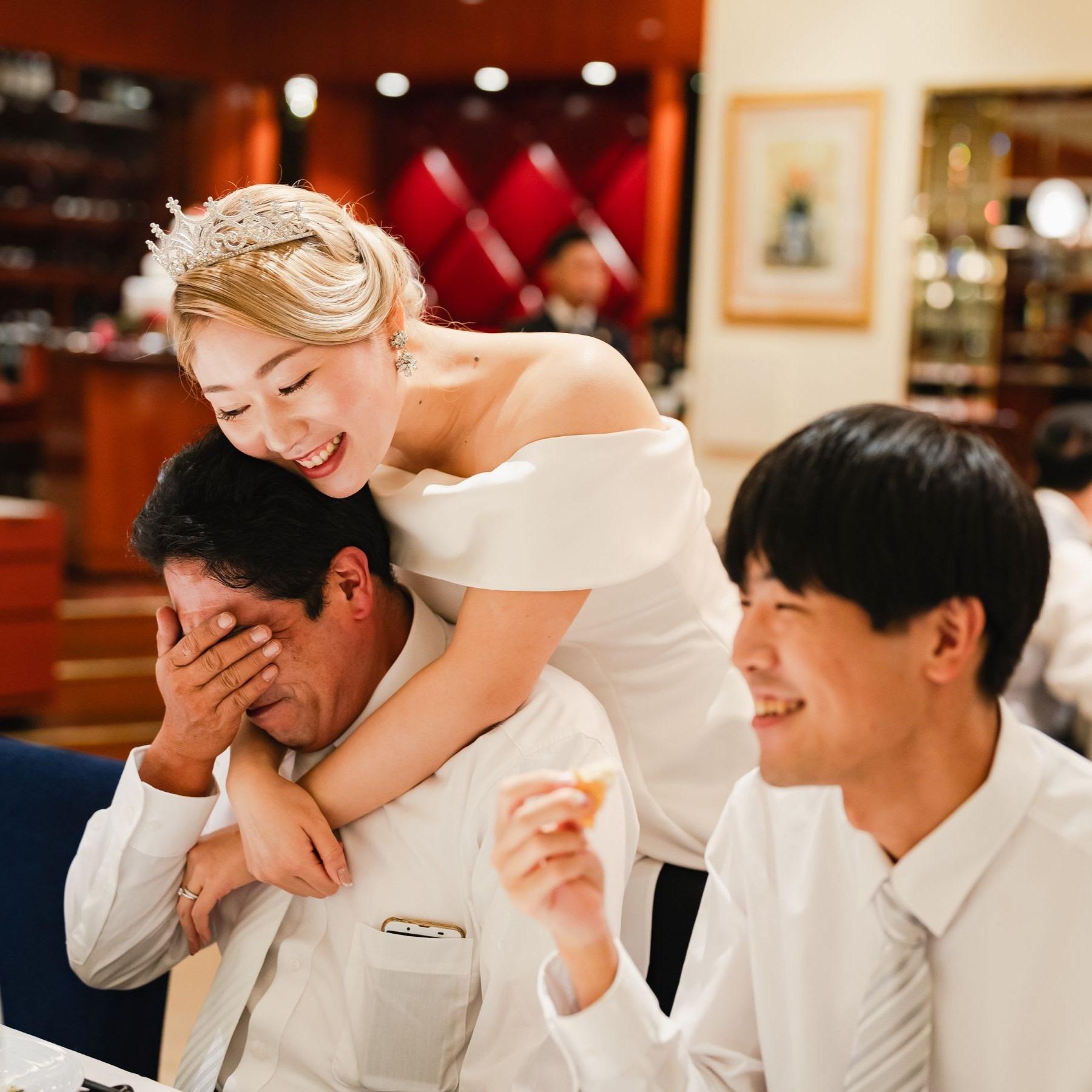 笑顔や涙の共感がひろがる、距離の近さが特徴的なパーティ会場。お2人が各テーブルを気兼ねなく行き来したり、メインテーブルに座ったままゲストと会話ができるような距離感が魅力。