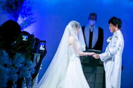 おふたりが挙式会場として選んだのは、幻想的なライティング演出『スターブレス』が行えるチャペル【アルファーレ】。新郎新婦の入場時には真っ白だったはずの会場が、聖母マリアの祝福に満ちたマリアンブルーのライティングでまるで星空の下にいるような空間に早変わり。スポットライトの中、純白のドレスに身を包んだ花嫁に、ゲストの皆様からは「きれい…」と感嘆の声が聞こえます。