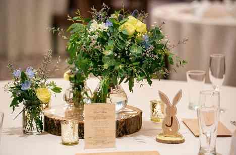 パーティー会場はご新婦様のお好みに合わせて『ナチュラル』にコーディネート。5月の挙式らしく爽やかなグリーンと木の温かみにあふれた会場となりました。各テーブルに割り振られたアルファベットの卓記号は、なんとご新婦様の手作り!おふたりで飼っているウサギちゃんがモチーフになっているそうです♪お席にはマスクケース、除菌ジェルなどが添えられ、感染症対策も万全の会場づくりとなりました。