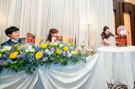 ゲスト参加型の演出としておふたりが選んだのは『パイレーツ・オブ・ナイフ』!皆さんご存じ、黒ひげのおじさんが飛び出してくるゲームの風船バージョンです。おふたりがゲストの為に用意した豪華賞品をかけて、いつ弾けるかわからない風船を前に、会場全体がドキドキハラハラ…。弾けた瞬間みんなでびっくり!会場全体が笑顔と拍手に包まれました。