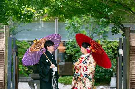 新型コロナの感染拡大により当初の開催日からの延期を選択なさったおふたり。不安なお気持ちがある中でもおふたり共にいつも明るく、当日もゲストの皆様に楽しんでいただけるようにとお打合せを進めていきました。そんななか行われた前撮りはホテル敷地内の日本庭園で。お天気にも恵まれ、万緑の中に打掛と番傘が映える素敵なお写真撮影となりました♪