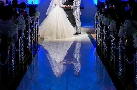 おふたりの挙式はキリスト教式にて執り行われました。挙式のはじまりは新婦お母様からのベールダウンをしていただき、新婦お父様とご入場、お父様からご新郎様へのバトンタッチの際には、しっかりとした握手を交わされました。互いの手を取り誓いの言葉を交わすおふたりのお姿は、幸せを願うサムシングブルーの照明のもと、天然の大理石で造られたバージンロードにも映し出され、なんとも幻想的な瞬間となりました。