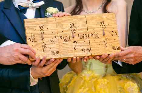 親御様への感謝のお気持ちをとても大事にされていらっしゃるおふたり。親御様へのプレゼントをお選びになる際、「花束も素敵だけど、何かカタチに残るものもプレゼントしたい」とお選びになったのは、一枚の木材から作られた3連時計。ご縁あってご結婚されたご新郎ご新婦様、そのおふたりによって繋がれたご両家のご縁、これからの時間を共に刻む時計に込められた想いがご両家の皆様にも伝わり、会場が温かい拍手に包まれました。