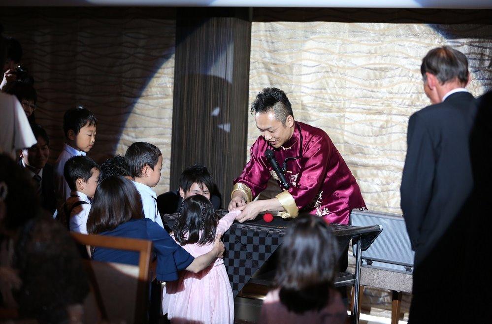 お色直し中、新郎新婦様が中座されている間もゲストの皆様に楽しんでいただきたいということで、プロのマジシャンの方をお招きされました。お子様からご年配の方まで楽しんでいただけるマジックで、新郎新婦様が会場にいらっしゃらない間も笑い声が絶えないご披露宴となりました。