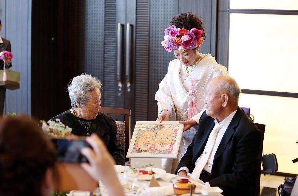 新郎新婦様共に、それぞれご列席のおじいちゃま、おばあちゃまへ似顔絵のプレゼントをされました。周りのご親族の皆様も、とてもお喜びになられた素敵な演出でした。