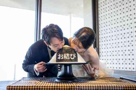 披露宴の中で普通のウェディングケーキをカットするのではなくおにぎりに齧る演出を取り入れました。共同作業としてふたりでおにぎりの仕上げに塩をかけて完成。サプライズバイトでは今までに大切に育ててくれた両親へふたりがおにぎりを握ってバイトをしました。 ウェディングケーキではなくおにぎりが出てきてみんなの反応が良かったです!