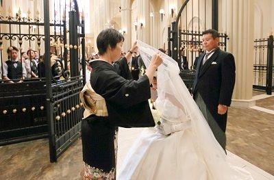 挙式にご列席の皆様に見守られながらのアイアンゲート前でのベールダウンセレモニー。 新たな門出をスタートされる新婦様に向けてのお母様からの最後のお支度は、感動的な一場面となりました。